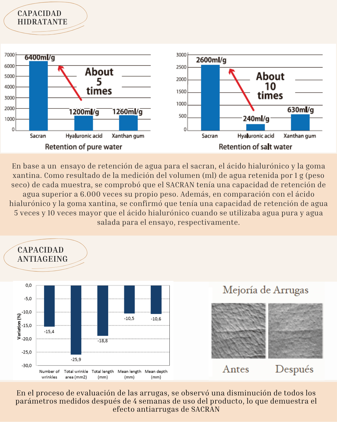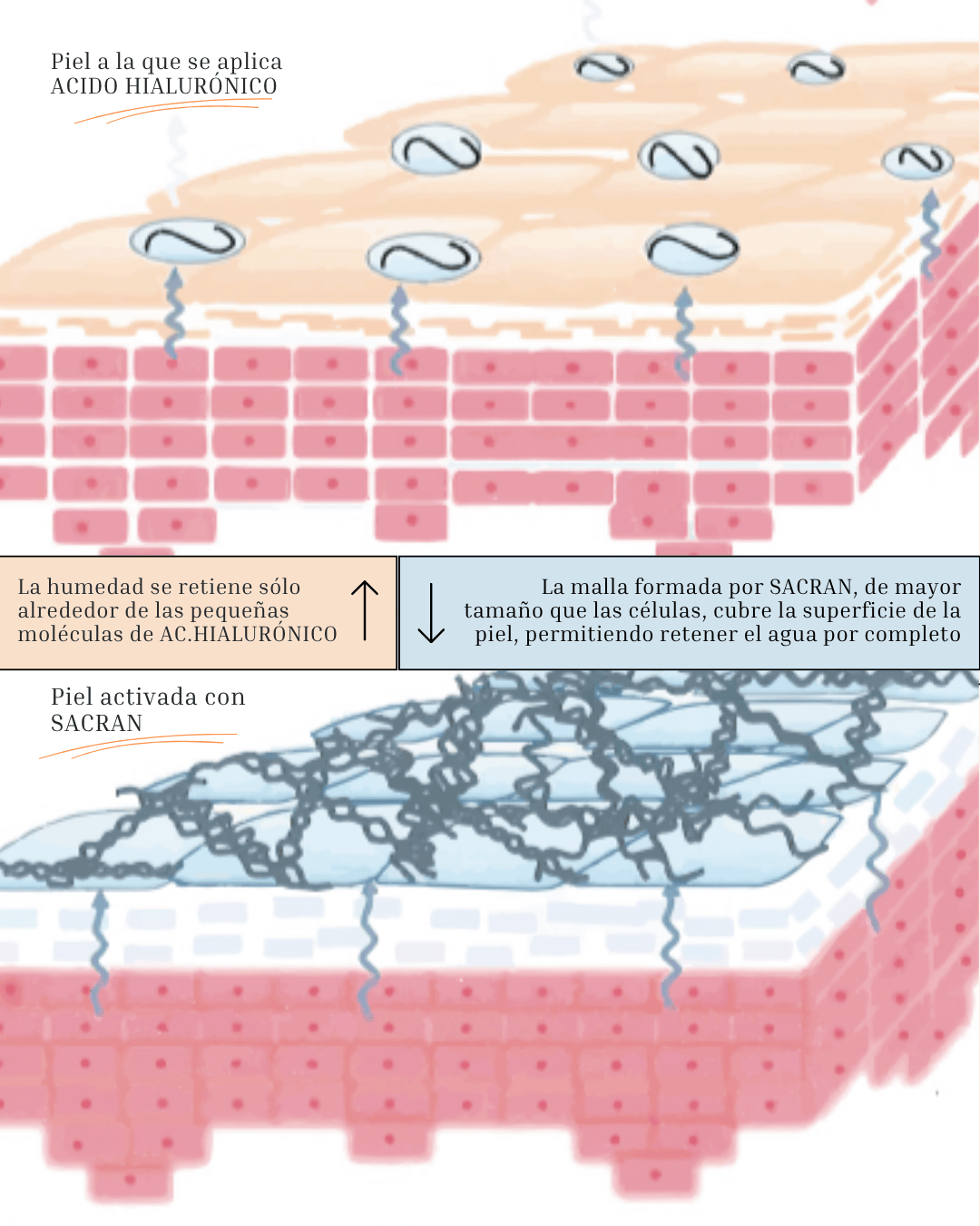 Estudios científicos han demostrado que el Sacran es capaz de retener 6000 veces su peso en agua y es 5 veces más hidratante que el ácido hialurónico.