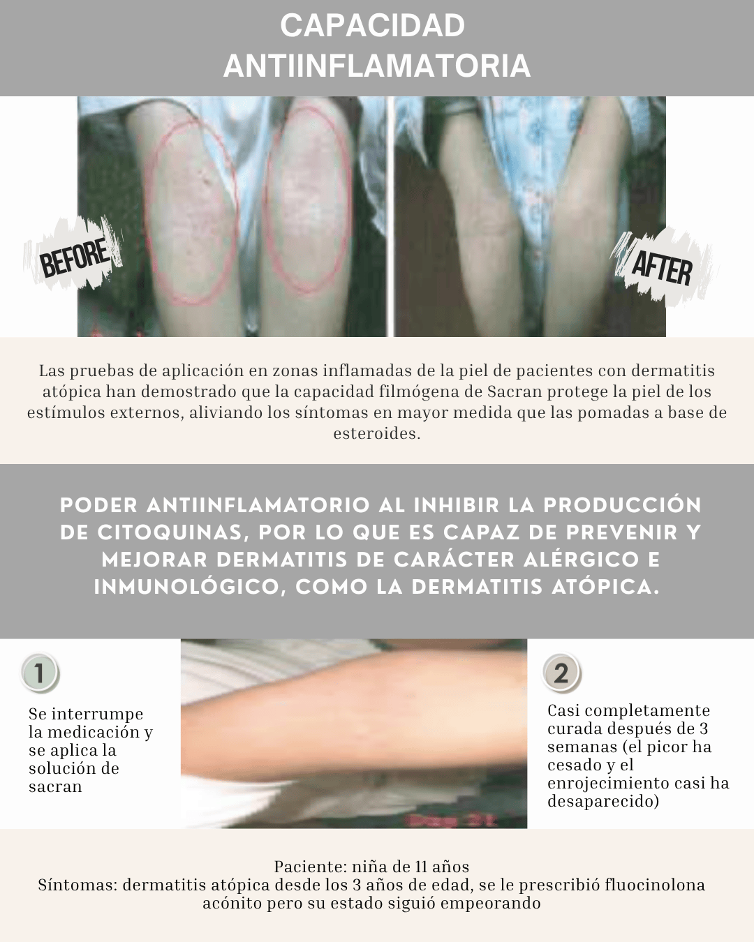 Entre sus efectos terapéuticos destaca su poder antiinflamatorio al inhibir la producción de citoquinas, por lo que es capaz de prevenir y mejorar dermatitis de carácter alérgico e inmunológico, como la Dermatitis Atópica.